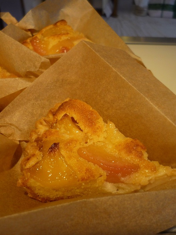 さくさくのパイの上にコンポートした桃をのせて焼きました。