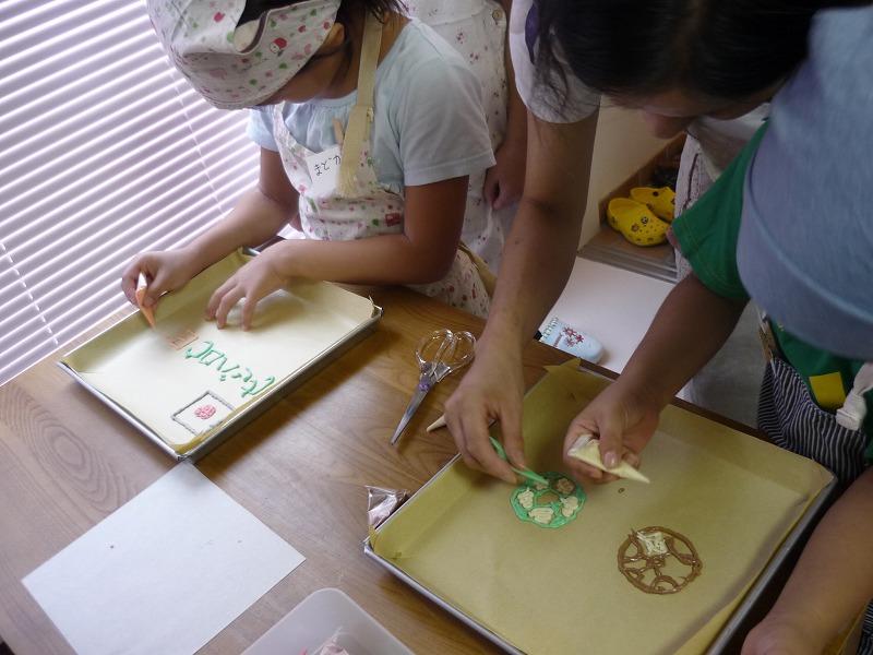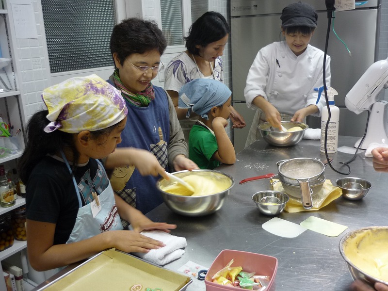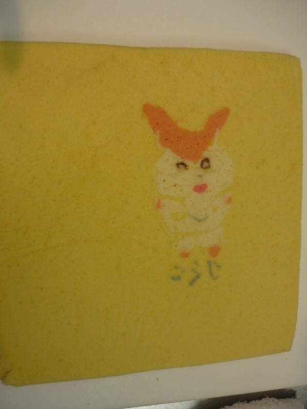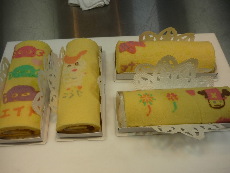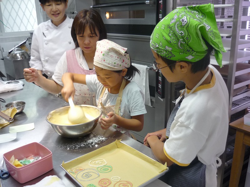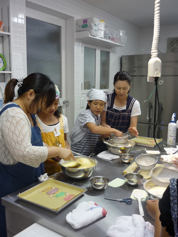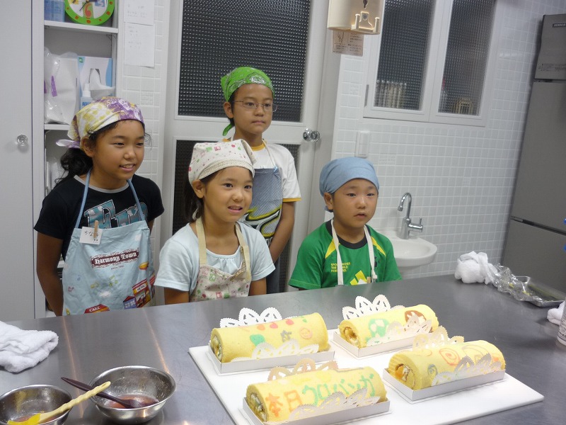 子供たちが絵を描いてお母さんがロールケーキの生地を作ります。