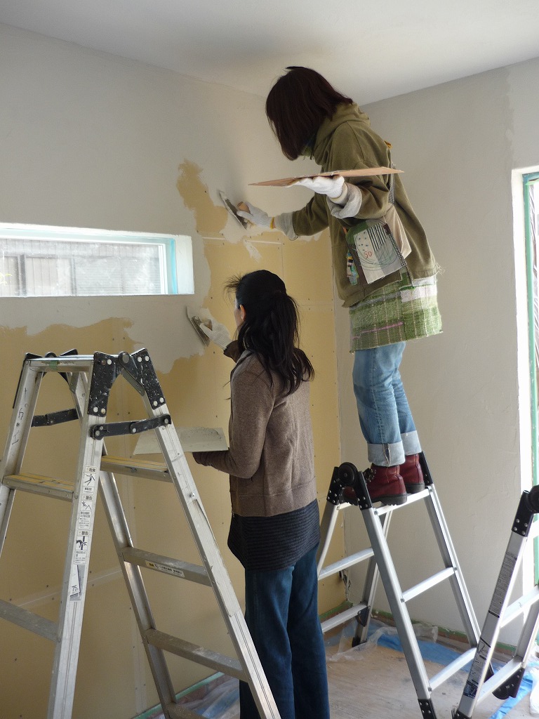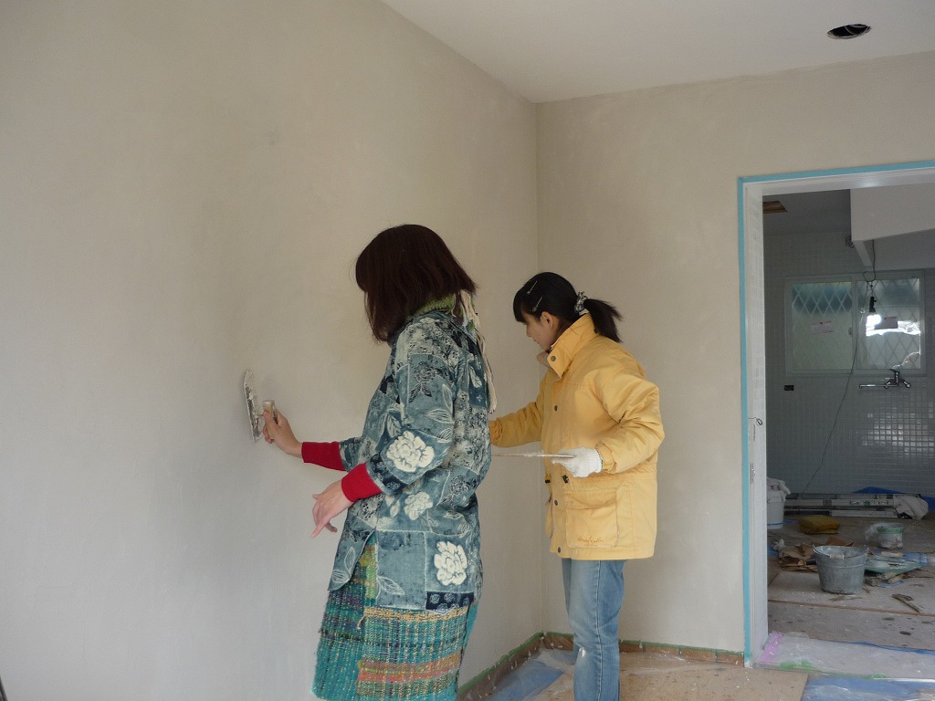 昨日からお店の壁塗りを始めました。昨日はお友達の明美さんと二人で、今日は双葉さんも参加して三人で珪藻土の下塗りです。珪藻土は練り方で硬さが変わるので水加減が難しい~。ちょっと硬いせいか塗るときに力がいるので肩や手が筋肉痛です。でもでもやっぱり塗るのは楽しい。明美さんは「乗ってきたよ!」と言ってどんどん塗っていきます。隅っこや窓枠を塗るのはちょっと大変ですが、ちょっとずつうまくなってきている感じがします。昨日はサカエの左官屋さんもいたのでちょっとアドバイスを受けましたし、わび助さんも心配して、のぞいてくれたりします。道具や材料、その他の下準備は全部サカエさんがしてくれたのでホントいいとこ取りです。明日からは仕上げ塗りです。壁が仕上がるとお店の雰囲気が出てくるでしょうね。